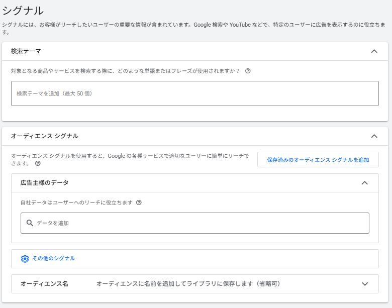 オーディエンスシグナルとは、Google 広告のP-MAX(Performance Max)キャンペーンで使用される「学習の出発点」となるデータシグナルです。