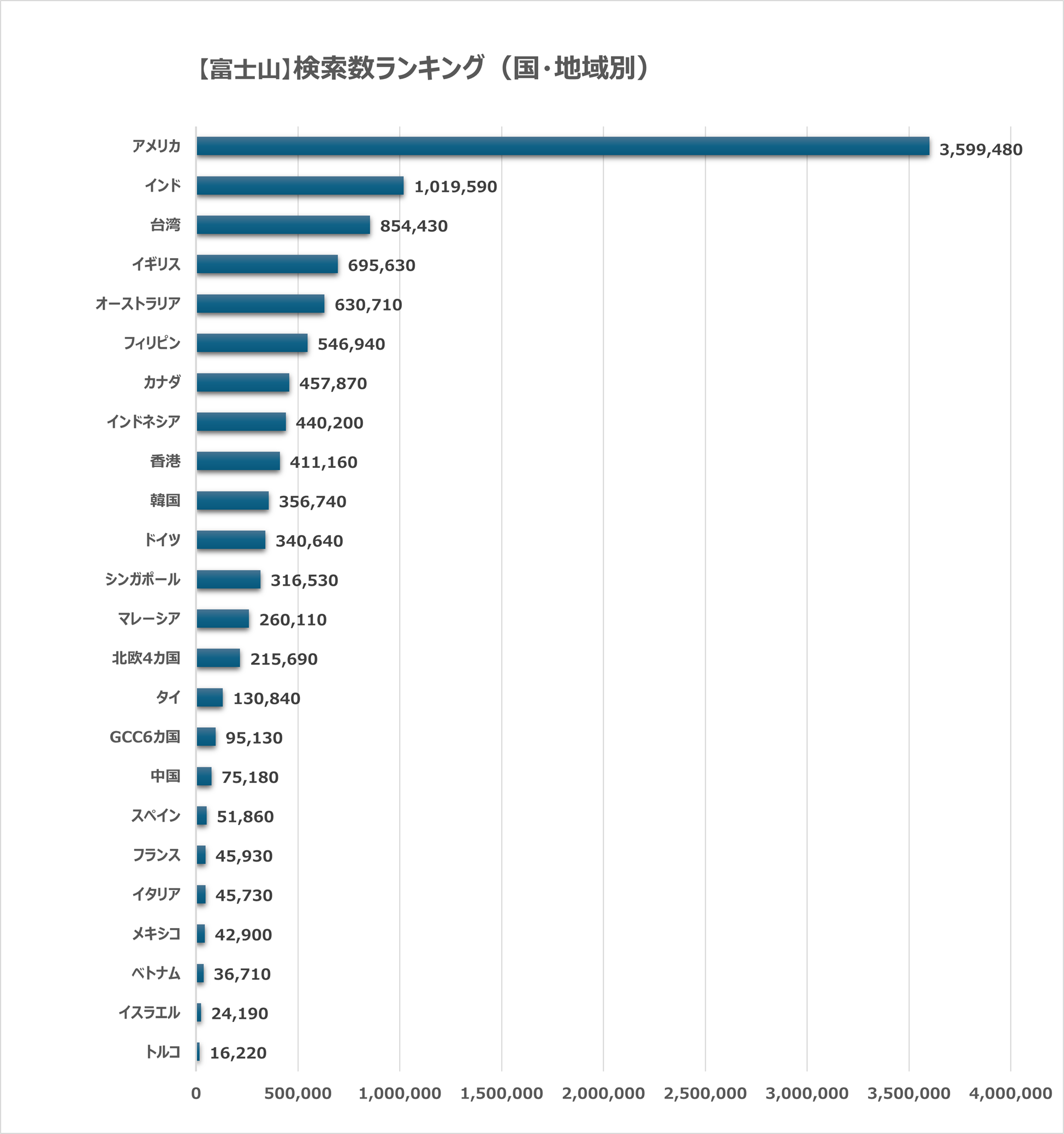 調査の結果、「富士山(Mt. Fuji)」に関する検索上位3ヶ国は、アメリカ、インド、台湾、の順となりました。各国が検索に至る主な背景は以下の通りです。