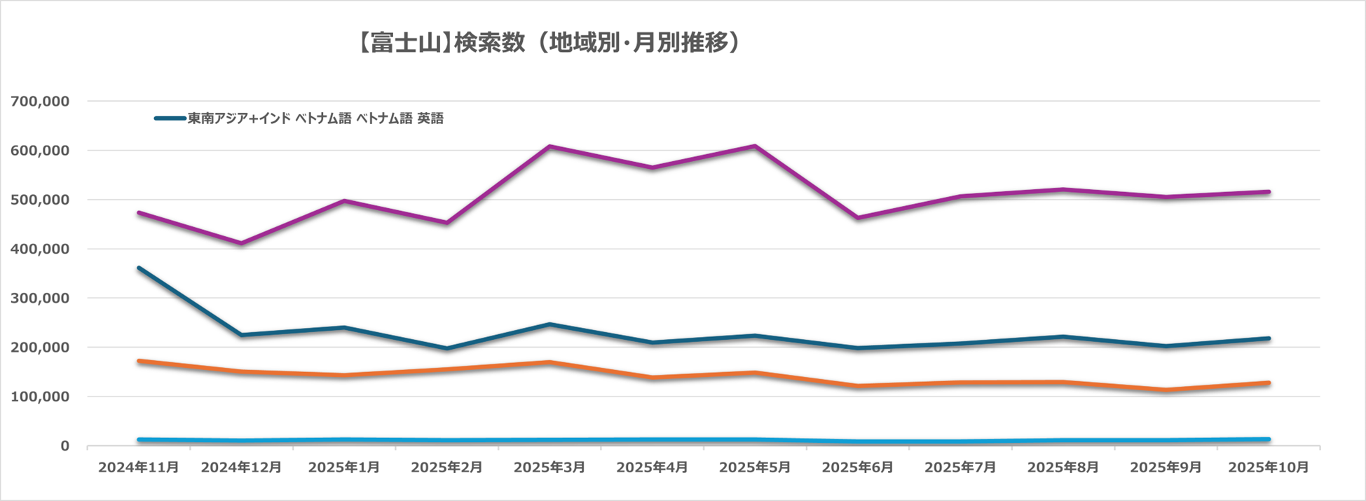 一方、東アジア+インドは年間を通じて安定した検索ボリューム(約20万~35万件)を維持しています。