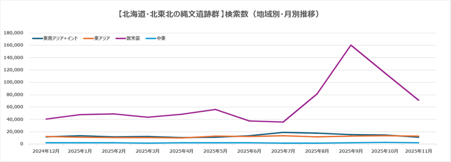 地域別では欧米豪からの検索が圧倒的多数を占めています。特に2025年9月に検索数が大幅に増加しましたが、これは同月に開催された国際的な観光見本市で、自然と共生する「アドベンチャーツーリズム」の重要拠点として本遺跡群が紹介されたこと*1や、大阪・関西万博開催が影響し、欧米の主要旅行メディアが「日本のサステナブルな歴史遺産」として特集を組んだことが、英語圏での関心の高まりに寄与した可能性があります。