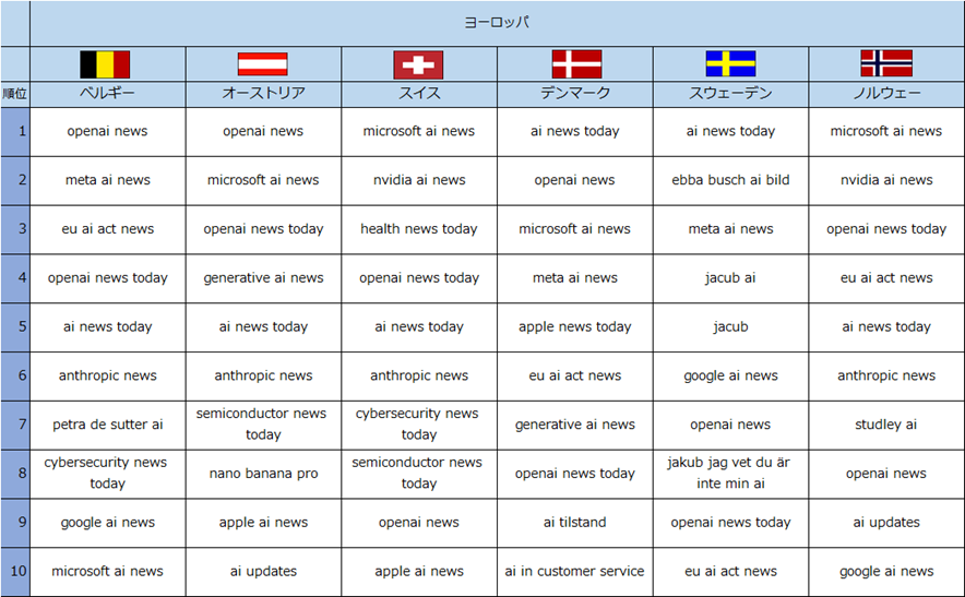 2025年の10月から2026年1月の期間における検索トレンドでは、各国でAIに関するニュース検索が定着していることが明らかになりました。その背景には、ベンダー各社の相次ぐ発表に加え、EU(欧州連合)が定める「EU AI Act(EU AI規制法)」への関心の高まりがあります。