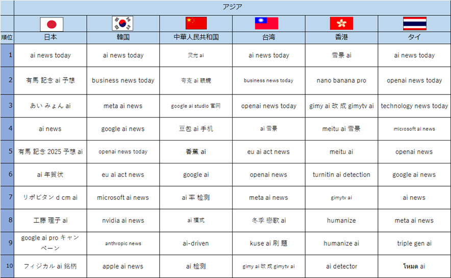 この度、世界40カ国・地域を対象に、2025年10月14日から2026年1月14日までの期間における、「AI」に関連したGoogle検索のキーワードを調査***しましたので、その結果をお知らせいたします。